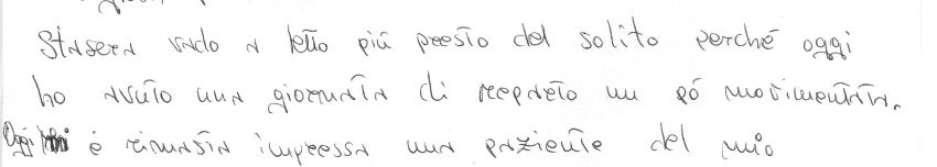 L�adozione della �Persona� permette al soggetto di compensare carenze ed insicurezze (scrittura staccata, rovesciata) in attesa di una strutturazione più solida dell�Io, che tuttavia indugia mirandosi nello specchio narcisistico rassicurante della forma stilisticamente ricercata (lettere a rovescio, stilizzazioni) vissuta esclusivamente come �effetto visivo�.